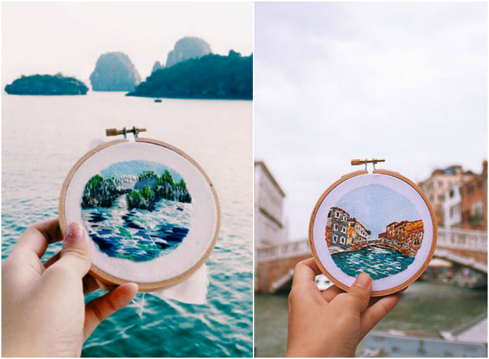 Чаще всего, чтобы запечатлеть какую-то достопримечательность или красивый пейзаж люди используют фотокамеру. Но дизайнер Тереза Лим пошла совсем иным путем. Путешествуя по миру, она вышивает понравившиеся места, таким образом, получаются совершенно невероятные реалистичные и красочные картины на ткани.