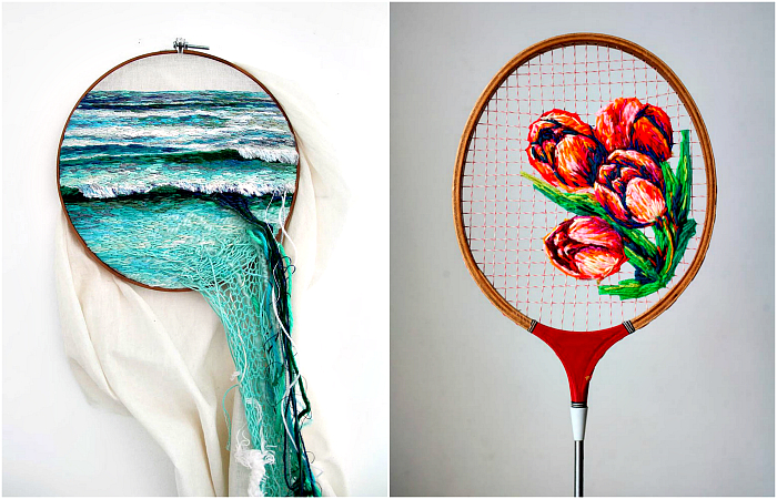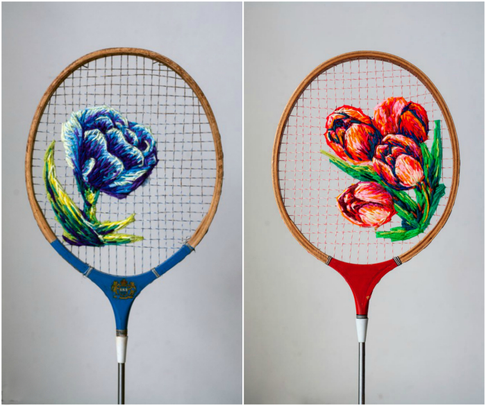 Даниэль Клаф из Южной Африки вместо обычного полотна для вышивки использовала струны винтажных теннисных ракеток. Серия картин вышла очень оригинальной, красочной и намного интересней стандартных вышитых крестиком работ, которые можно найти в любом магазине.