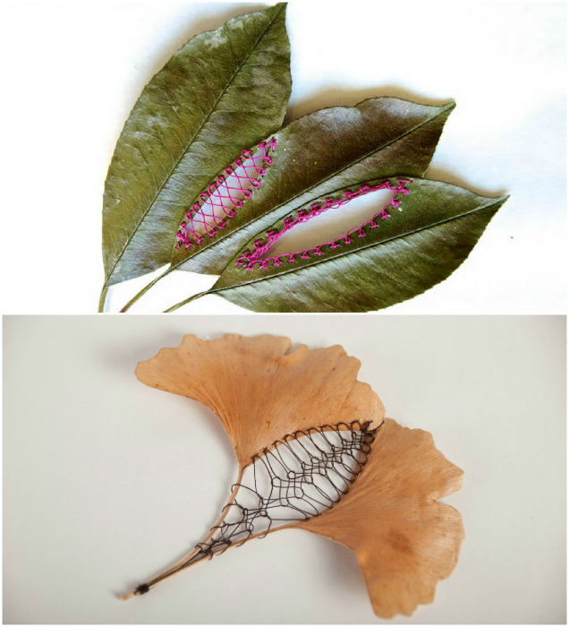 Американская рукодельница Хиллари Фейл украшает листья деревьев нежной ажурной вышивкой.