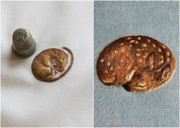 Рукодельница Хлои Джордано украшает ткань вышивкой с изображениями крошечных зверей, размером буквально с наперсток. Несмотря на крошечные размеры, вышитые рисунки поражают своей реалистичностью и плавными цветовыми переходами.