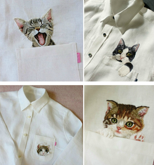 Японка Хироко Кубота вышивает очаровательных котиков, выглядывающих из нагрудных карманов рубашек. Со временем строгие рубашки, украшенные «карманными животными» завоевали огромную популярность в кругах деловых мужчин.